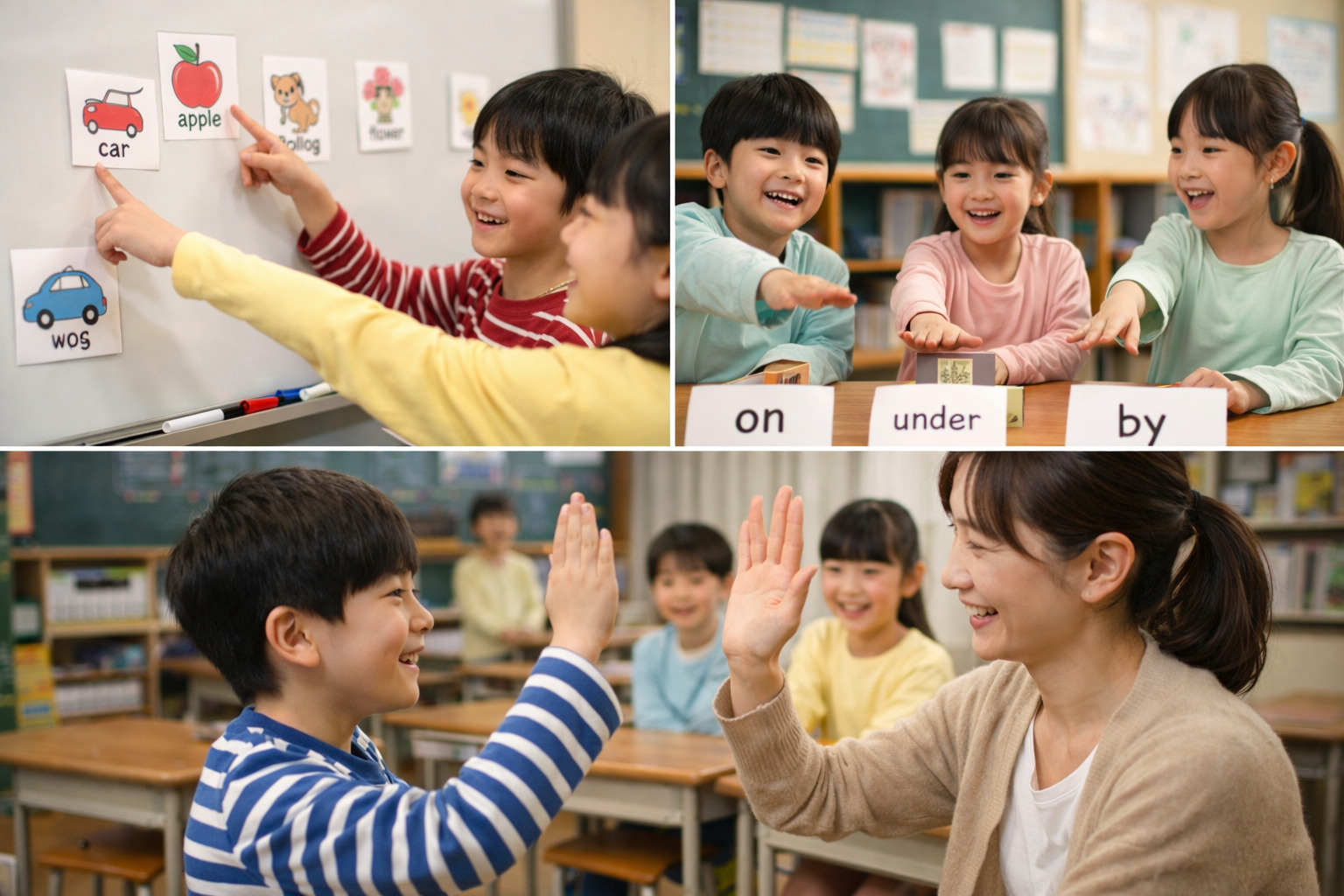 - 体を使ったジェスチャーで「in / on / by / under」の意味を楽しく覚える
